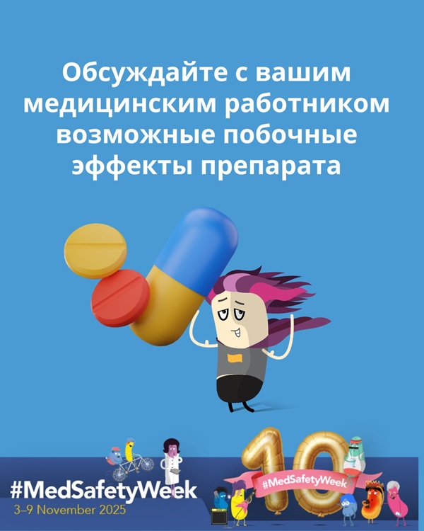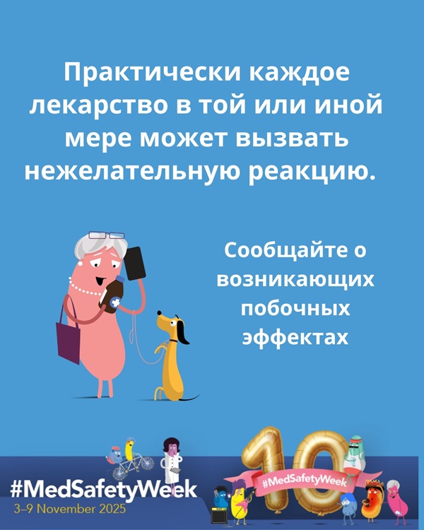 #MedSafetyWeek - это кампания, направленная на повышение осведомлённости о побочных эффектах лекарственных средств. Кампания включает широкий диапазон тем, связанных с безопасностью лекарств и вакцин: